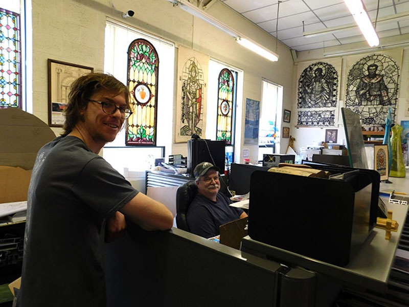 Our color selector has over 25 years experience in working with the various types of glass in our vast inventory. We keep approx. 1,800 different colors/textures of glass from worldwide resources at any given time. The glass for every project is laid out on a full size light up table for review by the artist prior to proceeding to the next level of manufacture, either the Paint Department of traditional stained glass or the Structural Stained Glass Department.