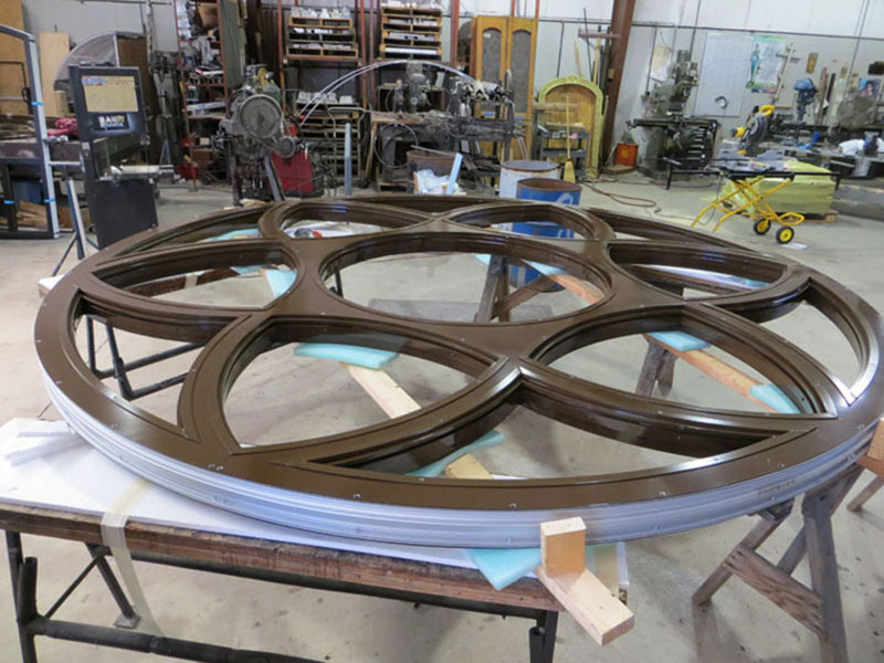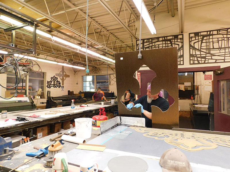 This is where the patented Structural Stained Glass® is fabricated. Intricate designs are milled into anodized aluminum sheets by a digital routing machine. Patterns for the glass areas are made by the computer and the glass is cut in the glass department. When the glass is ready to be cast in the panel it is returned to the Structural Stained Glass® Dept. The milled aluminum sheets are set up in preparation of casting with epoxy resin. The cured epoxy is removed from the glass areas, trimmed and cleaned. Before leaving this department an artist must inspect the sections prior to loading the truck for installation.