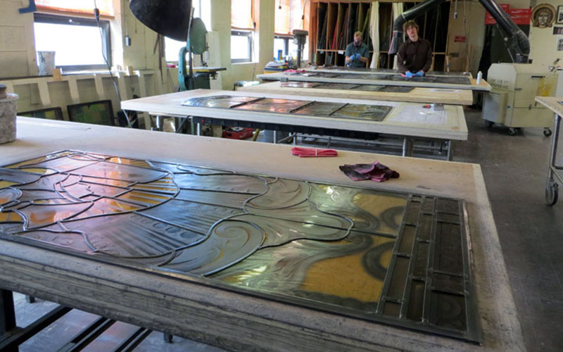 The painted and fired glass for Traditional Stained Glass is assembled in the Glazing Department using the trditional methods of leaded work. The lead came are NEVER STRETCHED, as this can weaken an already plable, soft material. All Joints are soldered on both sides and added to increase the structure of the sections. Before leaving this dept., an artist must inspect the sections prior to loading the truck for installation.